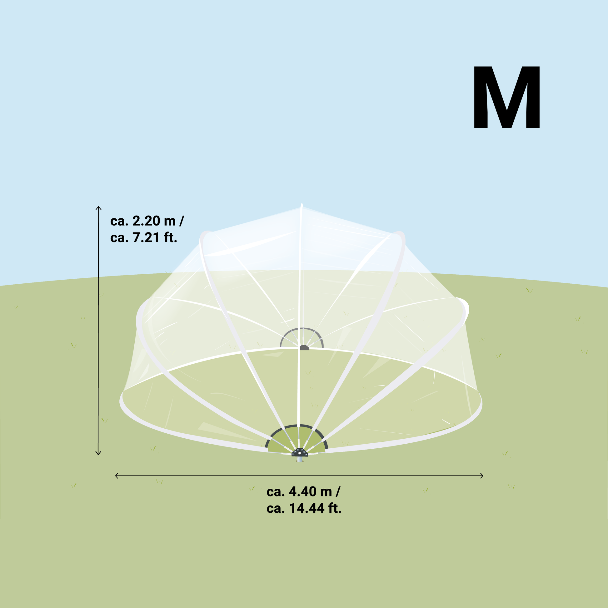 Sensitivity of SunnyTent Round L+ and XL to Wind: SunnyTent Round L+ and XL models come with a cross pole set included. Due to their larger sizes, these tents are more sensitive to wind and are, therefore, less suitable for windy and exposed locations. It is advisable to always open them during windy conditions for safety.